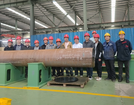 ? ? 2023年4月6-9日,中油寶世順(秦皇島)鋼管有限公司(以下簡(jiǎn)稱“寶世順公司”)擴(kuò)徑機(jī)項(xiàng)目組成員對(duì)華進(jìn)公司制作的新能源管材生產(chǎn)線全長(zhǎng)擴(kuò)徑機(jī)組進(jìn)行預(yù)驗(yàn)收。寶世順公司項(xiàng)目組一行首先對(duì)供貨設(shè)備外觀進(jìn)行查驗(yàn),其次,按照供貨明細(xì)進(jìn)行盤(pán)查清點(diǎn),最后在設(shè)備裝配現(xiàn)場(chǎng),使用該臺(tái)設(shè)備對(duì)直縫焊管(型號(hào):直徑610mm,長(zhǎng)度12.5米)進(jìn)行分步擴(kuò)徑。在預(yù)驗(yàn)收總結(jié)會(huì)上,寶世順公司項(xiàng)目組成員對(duì)華進(jìn)公司制作的設(shè)備給予高度評(píng)價(jià),最終得出結(jié)論為全長(zhǎng)擴(kuò)徑機(jī)組的外觀、性能均符合預(yù)驗(yàn)收的標(biāo)準(zhǔn)。